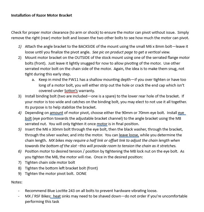 ¿Quieres eliminar el tensor de cadena o instalar una rueda trasera más grande (hasta 110/70-12) en tu Razor SX500, MX500/650 o RSF650? Este soporte de motor ajustable para motores estilo MY1020 es una solución rápida y sencilla, y viene en un atractivo acabado negro mate.