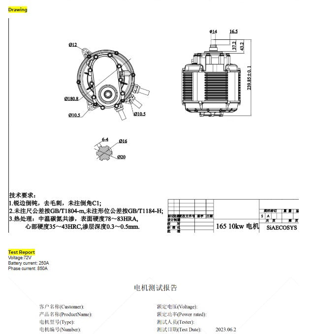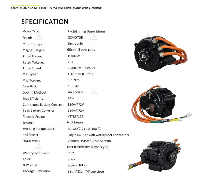 Here's THE beast! The QS165 has a reputation for performance and the V3 is no different! Sporting a 72V 10kw rating (20kw peak), this monster features reduction gearing 1:2.37 to allow you to put the power to the ground without an unusually large rear sprocket.