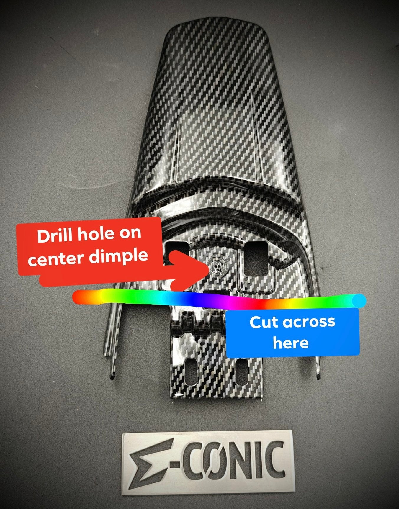 Rear Tail Fender requires cutting straight across—use dremel or thick shears to clean cut the plastic. Drill center hole in dimple to secure the unit with stock screw.